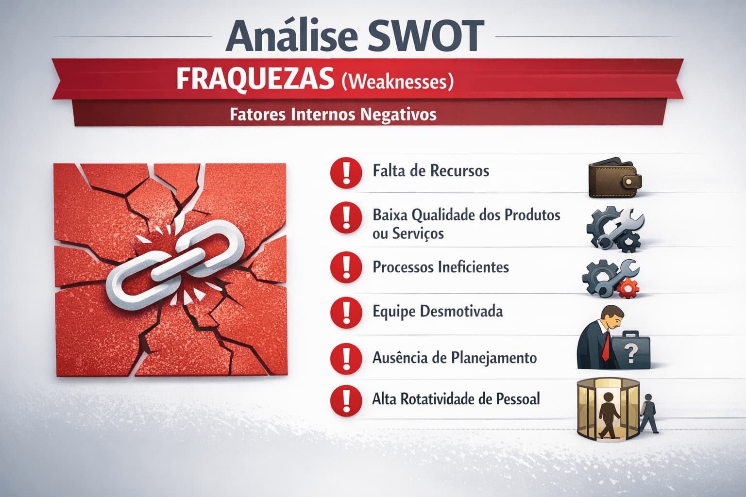 Diferente das ameaças, que vêm de fora, as fraquezas estão dentro da própria organização, na estrutura, nos processos, na gestão, na comunicação, na equipe ou no modelo de negócio.
