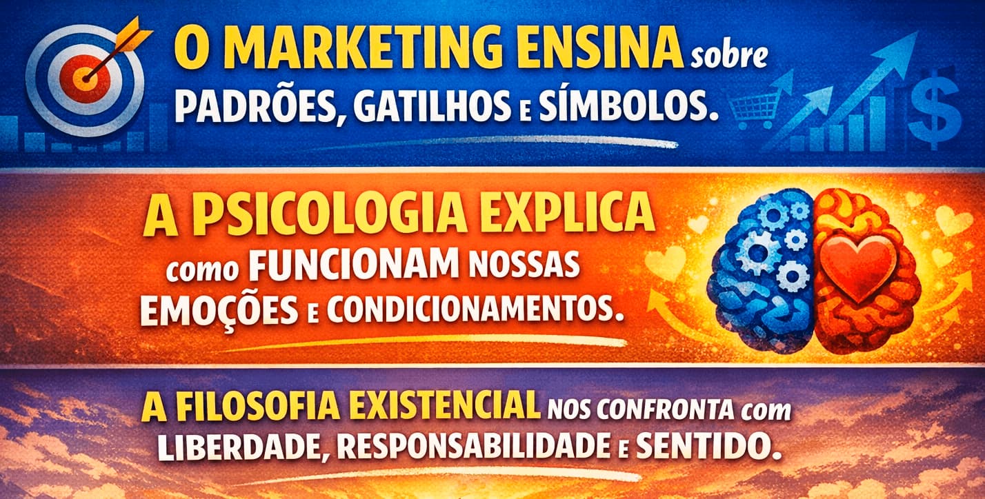 O marketing ensina sobre padrões, gatilhos e símbolos, a psicologia explica como funcionam nossas emoções e condicionamentos, a filosofia existencial nos confronta com liberdade, responsabilidade e sentido.