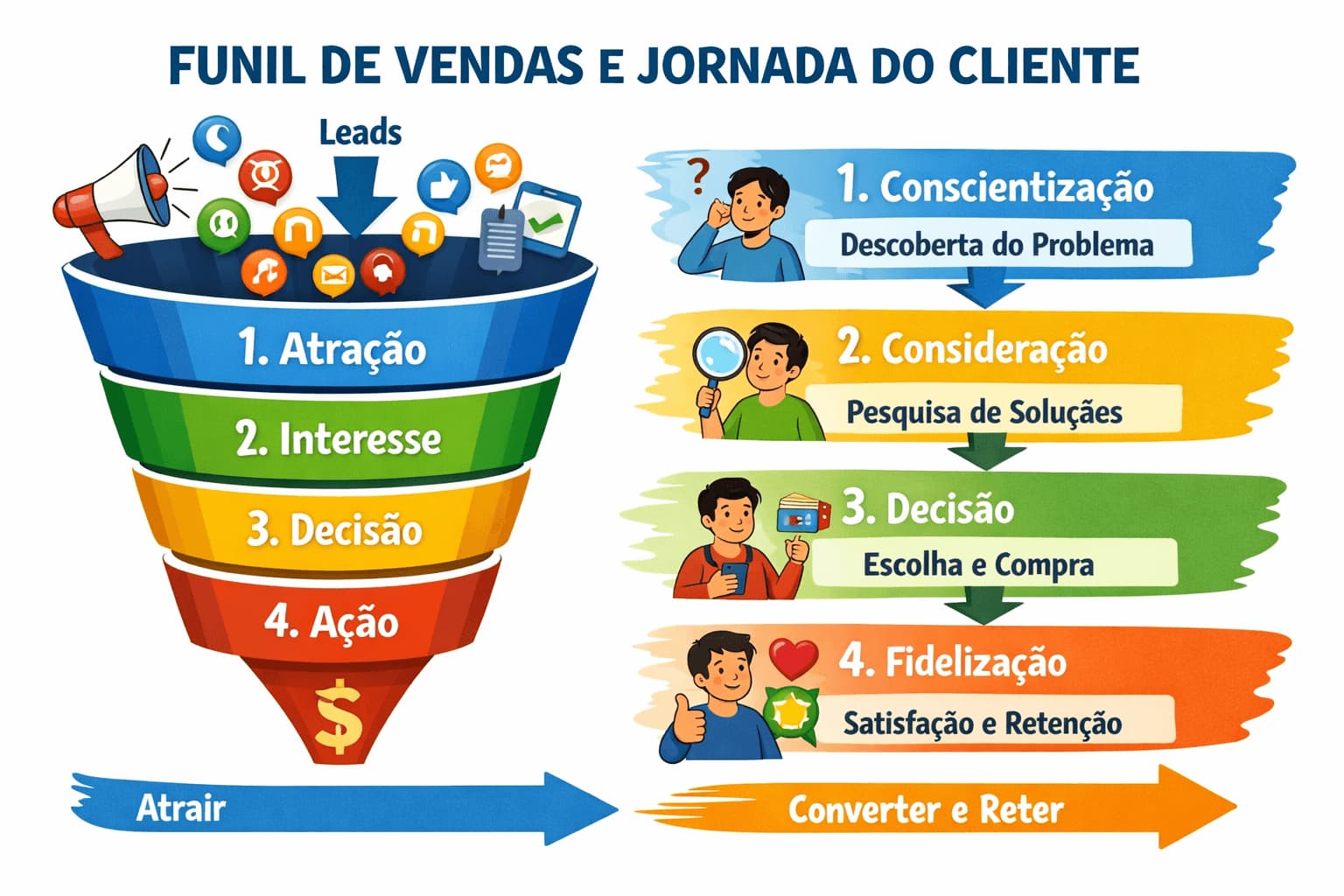O funil normalmente se divide em três grandes etapas: