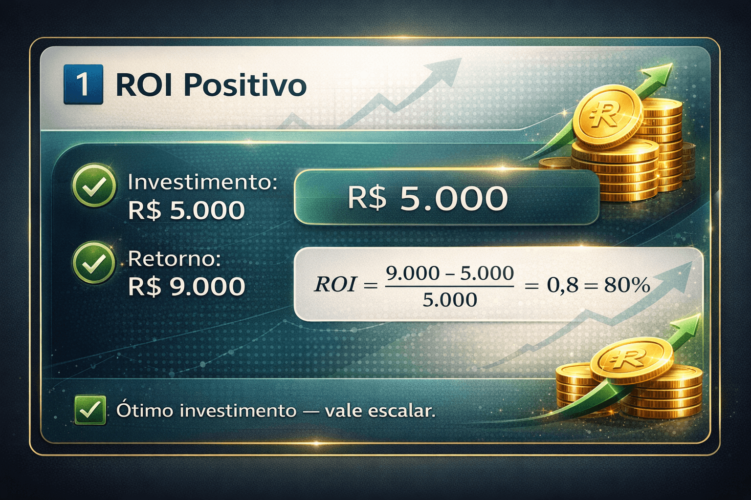 Se CAC e LTV mostram quanto custa adquirir e quanto vale um cliente, o ROI mostra se o negócio está realmente lucrando.
