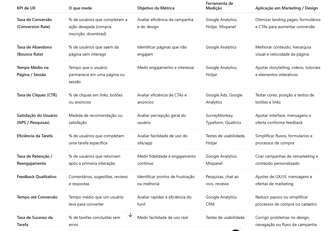 KPIs de UX transformam a percepção da experiência do usuário em métricas acionáveis para campanhas de marketing. Monitorando conversão, engajamento, satisfação e eficiência de tarefas, é possível ajustar estratégias, melhorar resultados e criar experiências que convertem e fidelizam o público.