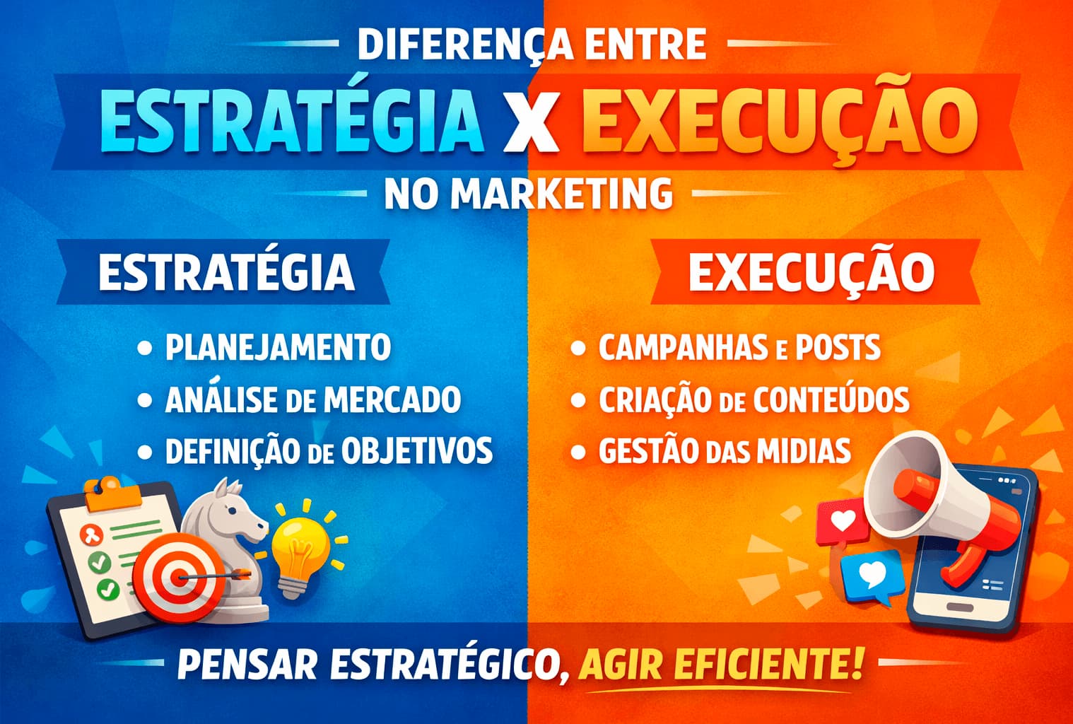 No marketing, essa diferença é decisiva. Estratégia constrói posicionamento. Execução constrói performance. Estratégia cria vantagem. Execução transforma vantagem em resultado mensurável.